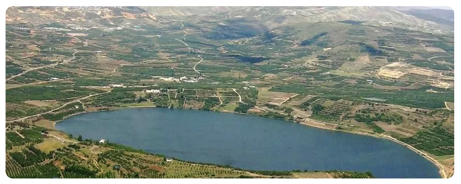 Um lago de cratera vulcânica perto da fronteira com a Síria, com água azul escura preenchendo um vulcão extinto a 940 metros de altitude.