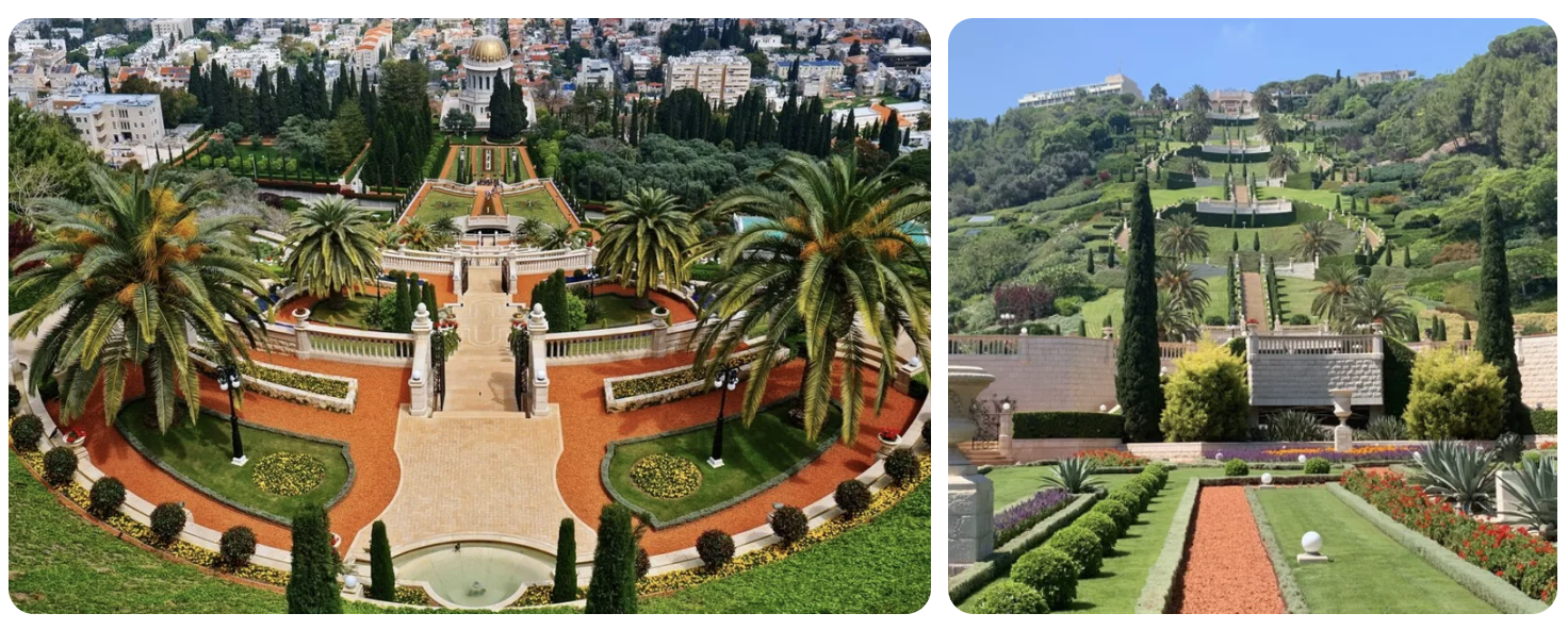 No centro, ergue-se o Santuário do Báb, com sua cúpula dourada, o segundo local mais sagrado da fé Bahá'í, reluzindo sobre a Baía de Haifa. Os jardins simétricos apresentam canteiros de flores impecáveis, sebes esculpidas, fontes e escadarias precisamente alinhadas que criam padrões geométricos deslumbrantes, tanto de cima quanto de baixo.