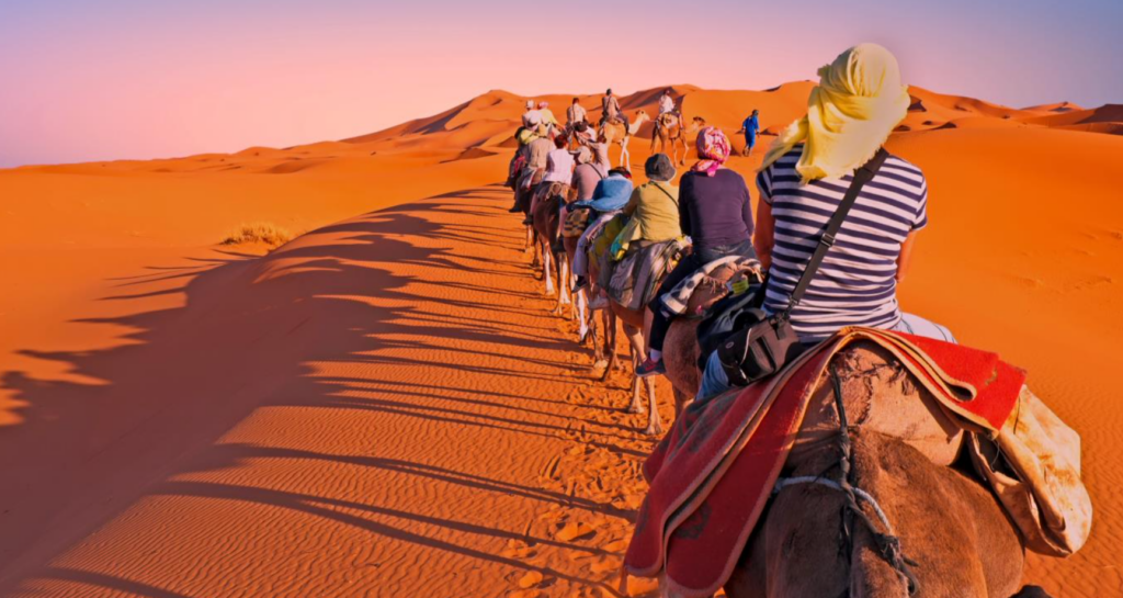 Após o café da manhã, iremos em direção ao deserto. Viagem até ao Médio Atlas com passagem em Ifrane (Suiça Marroquina) e na Floresta dos Cedros em Azrou para conviver com os seus habitantes, os macacos selvagens. Atravessaremos as Gargantas e Vale do Ziz, preenchido por Palmeiras e culturas familiares. Passaremos por paisagens magnificas, Vale do Ziz e Barragem Hassan II. Pegaremos a estrada desértica do sul e ao mesmo tempo ir entrando lentamente no espírito do deserto. No fim da estrada estará o grandioso Deserto do Sahara. Os dromedários já aguardam pacientemente, para transportar os seus convidados ao interior das dunas, bem no coração do Sahara. No fogo o repasto ganha forma para o jantar servido à luz das velas. Esta é uma experiência única que permite vivênciar o verdadeiro espírito da vida dos nómadas berberes. Alojamento em tendas devidamente preparadas para turismo. Jantar e alojamento em Acampamento de luxo AL QADAR MP