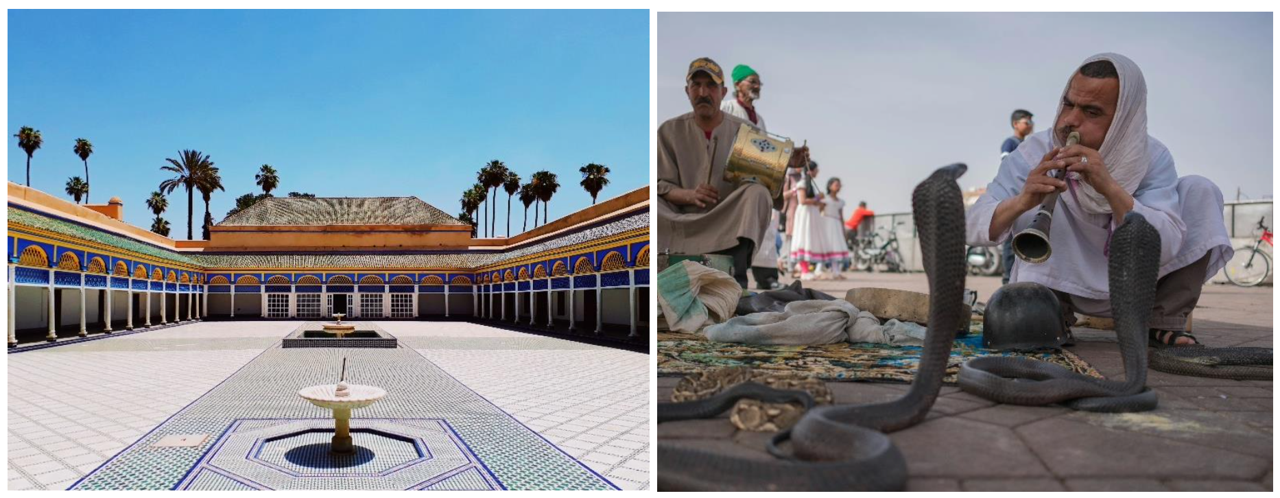 Tomaremos café da manhã no Riad e com um guia local percorreremos a Medina antiga e seus souks (mercados). Cidade colorida e com um movimento especial. Terra de sultões e concubinas, transparece sua riqueza nos palácios e jardins que enchem a cidade de cor e glória. Gente de todo o mundo preenchem as ruas e riads, dando vida à sua famosa Praça Djamaa El Fna. TARDE LIVRE. Jantar e alojamento